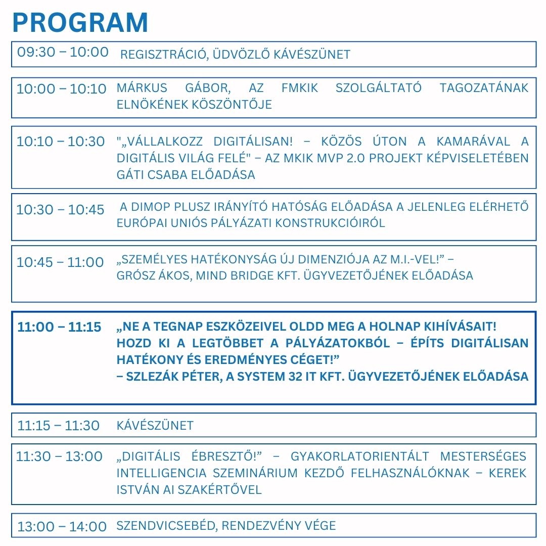 Az esemény a Magyar Kereskedelmi és Iparkamara programjaként átfogó, gyakorlati útvonalat mutat a KKV-k digitális felzárkózásához: megismered, milyen támogatások érhetők el, mely jó gyakorlatokkal lehet gyorsan és biztonságosan előrelépni online, milyen finanszírozási lehetőségek és digitális eszközök segítenek, és lépésről lépésre módszertant kapsz az MI mindennapi folyamatokba illesztéséhez – külön figyelemmel a változásmenedzsmentre, az információbiztonságra és a mérhető eredményekre.