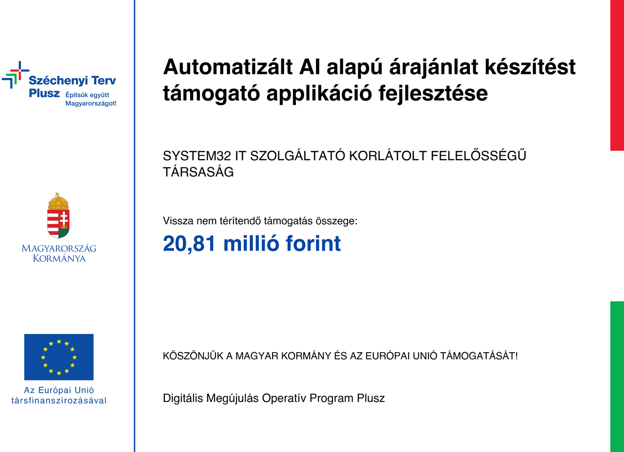 A System32 IT Szolgáltató Korlátolt Felelősségű Társaság a Digitális Megújulás Operatív Program Plusz (DIMOP PLUSZ) Program keretén belül a DIMOP_PLUSZ-1.1.2/A-24 jelű, Dedikált K+F+I és piacra lépést támogató program a digitális gazdaság szereplőinek – Digitális termék-innovációs fejlesztések című felhíváson sikeresen pályázott. A Támogató döntése alapján a Kft. vissza nem térítendő európai uniós támogatásban részesült, 20,8 millió Ft összegben, 70%-os támogatási intenzitás mellett.